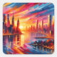 Ein lebhafter Sonnenuntergang über einer lebhaften Stadtumgebung mit warmen Orange- und Rosatönen, die sich von Wolkenkratzern aus Glas abheben.