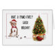 Eine humorvolle Weihnachtskarte, die einen schicken Bullenfresser mit einer Weihnachtsmannmütze und einer Bogen-Krawatte darstellt. Wünschen Sie einen Urlaub, über den es sich zu bellen lohnt!
