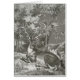 Ein Hirsch, Jungfrau, liegt auf dem Boden in einem Wald. Vintage, antike Abbildung.