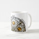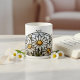 Celebrate April with this Daisy stained glass-inspired mug. White daisies with golden centers appear luminous in a circular design. Not real stained glass, printed on durable ceramic. Add a name and flower meaning (“Innocence”) for birthdays or keepsakes.