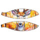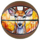 A beautiful stained-glass image of a deer. The deer is front and center, wading through water with trees in the background. The colors yellow, orange, and blue dominate the scene. The deer is standing tall with confidence and calmness. He is in his element. This stained-glass image stands out to any animal lover seeking uniqueness and style.