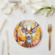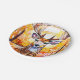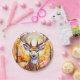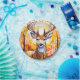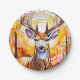 A beautiful stained-glass image of a deer. The deer is front and center, wading through water with trees in the background. The colors yellow, orange, and blue dominate the scene. The deer is standing tall with confidence and calmness. He is in his element. This stained-glass image stands out to any animal lover seeking uniqueness and style.