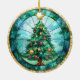 This elegant round ornament features a vibrant, classic Christmas tree scene designed to mimic the beautiful, jewel-toned appearance of a stained glass window. It features a decorated evergreen, a bright star topper, and rays of light shining through a deep emerald and sapphire background.