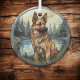 A beautiful German Shepherd Dog is the feature on this pretty glass ornament. The dog sits in front of a peaceful blue pond with a mountain forest pine trees surrounding it. This ornament makes a nice stocking stuffer at Christmas, but can be displayed all year long. I like to hang mine in a window that receives plenty of sunshine!