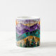 This vibrant coffee mug features an intricate stained glass mosaic design of a mountain landscape at sunrise. The art showcases rich jewel tones of purple, teal, and orange, framed by fine gold lines. This unique artistic mug is a perfect gift for nature lovers, hikers, and anyone who enjoys sophisticated, colorful home decor.