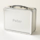 Diese "Stainless Lunch Box" ist eine graue Farbe. Der Name Peter ist auf der Lunchbox vorne und hinten. Der Name ist in Silbertext. Sie können den Namen mit der Schaltfläche Personalisieren ändern.