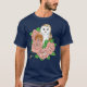 Eine Scheuneneule mit einem Halbmond auf der Stirn liegt inmitten rosa Blume in dunkelblau.