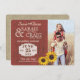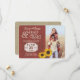 Rustikales Stallholz Land Save the Date mit Foto mit Sonnenblumen und Burldesign auf der Rückseite. Personalisieren Sie Text wie gewünscht und fügen Sie eine Hochzeitswebsite-Adresse oder andere Informationen auf der Rückseite.
