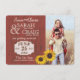 Rustikales Stallholz Land Save the Date mit Foto mit Sonnenblumen und Burldesign auf der Rückseite. Personalisieren Sie Text wie gewünscht und fügen Sie eine Hochzeitswebsite-Adresse oder andere Informationen auf der Rückseite.