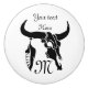 Ein langgezogener schwarzer Schädel aus schwarzem Tinte Tätowierungsstil. Von einem der Hörner ist eine schwarze Feder im Schablonenstil. Zwischen Schädel und Feder ist ein Weiß, das für veränderbare Monogramme bestimmt ist. Die Dosis ist für Monogramm kurz und kann nach Herzwunsch geändert werden