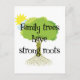 Das Genealogiedesign auf dieser Postkarte beinhaltet einen zeichn eines Baumes mit Sonne und Wolke und den Titel "Familienbaumen haben starke Wurzeln.".
