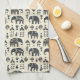 Rustikales Stammes-Elefanten-Muster-Küchentuch mit mutigen schwarzen Elefantensilhouetten, geometrischen Motiven und volksinspirierten Details auf neutralem texturierten Hintergrund. Ein stilvolles und zeitloses Design, ideal für Safari-Liebhaber, Boho-Dekor-Fans, Kinderzimmer-Themen und alle, die ethnisch inspirierte Kunst lieben.