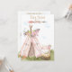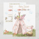 Ein Teepee Zelt mit Blume in einem Blumenstrauß liegt am FOX auf einem Baumstumpf mit Grünpflanzen, Blätter und einem Blumenstrauß. Unter dem Namen BABY SHOWER befindet sich ein blumengeschmückter ARROW.