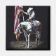 Ein wunderschönes Foto des Cowgirl auf einem Palomino & weißen Paint Horse, das die amerikanische Flagge während der National Anthem auf der Snake River Stampede von 2014 hält.