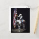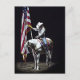 Ein wunderschönes Foto des Cowgirl auf einem Palomino & weißen Paint Horse, das die amerikanische Flagge während der National Anthem auf der Snake River Stampede von 2014 hält.