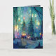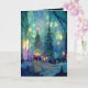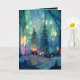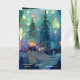 Eine schöne Weihnachtskarte mit Lichtern und einer Ansammlung in der Gemeinde im schneebedeckten Abend. Wasserfarbe im Stil von Alphonse Mucha.