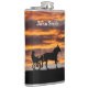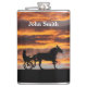 Standard Trotting Racehorse bei Sonnenuntergang, Drink Flask. Digitale Kunst. Silhouette von Standardpferd und Fahrerjog bei Sonnenuntergang. Vollständig anpassbar, machen Sie es zu Ihrem eigenen. Bearbeiten Sie den Text nach Ihren Wünschen oder entfernen Sie ihn ganz.