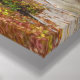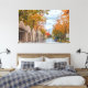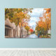 Das Bild zeigt die Campus-Straße der Stanford University, gesäumt von Bäumen in Herbstfarben, von grün und gelb bis orange und rot. Ein Radfahrer fährt die nasse Straße hinunter und fährt in Richtung Gebäude mit Blick auf den Hoover Tower in der Ferne. Die Gebäude an der Straße sind aus hellem Stein. Der Himmel ist bedeckt, was auf einen neueren Regen hindeutet.