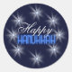 Dieses schöne Aufkleber-Design hat acht funkelnde Sterne von David in einem Array um den Text 'Happy Hanukkah'. Hintergrund ist Mitternachtsblau, umgeben von weißen Sternen.