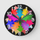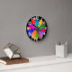 Diese Wanduhr hat ein modernes Design eines Kranzes aus Sternen in Rot, Orange, Gelb, Grün, Blau und lila.