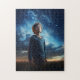 Ein kleiner Junge steht in einem Dämmerfeld, die Augen heben sich zu einem Sternenhimmel, der mit kosmischer Schönheit pulsiert. Die Atmosphäre humert mit einem ruhigen Rätsel, als ob die Sterne selbst Geheimnisse flüstern, die nur die Träumer hören können.