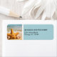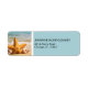 Adressetiketten mit einem niedlichen Foto eines Seesterns, der aufrecht im Sand positioniert ist. Unter seinen Armen befinden sich 2 kleine Muscheln, die sich bequem ausruhen. Set an einem Strand mit Wellen im Hintergrund.