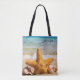 Eine personalisierte Tasche, perfekt für den Strand! Entworfen mit einem niedlichen Foto eines Seesterns, aufrecht im Sand positioniert. Unter seinen Armen befinden sich 2 kleine Muscheln, die sich bequem ausruhen. Set an einem Strand mit Wellen im Hintergrund.
