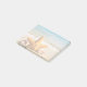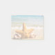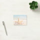 Sticky notiert ein niedliches Foto eines Seesterns, der aufrecht im Sand positioniert ist. Unter seinen Armen befinden sich 2 kleine Muscheln, die sich bequem ausruhen. Set an einem Strand mit Wellen im Hintergrund.