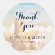 Ein Dankeschön Aufkleber für eine Hochzeit oder andere Veranstaltung. Entworfen mit einem niedlichen Foto eines Seesterns, aufrecht im Sand positioniert. Unter seinen Armen befinden sich 2 kleine Muscheln, die sich bequem ausruhen. Set an einem Strand mit Wellen im Hintergrund.