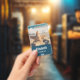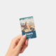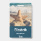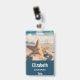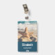 Abzeichen mit personalisiertem Namen mit einem landschaftlichen Foto. Ein großes Set aus Seestern direkt am Sandstrand. Ein schönes blaues Meer mit weißen Wellen im Hintergrund.