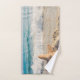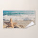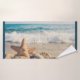 Handtuch Set mit landschaftlichem Foto. Ein großes Set aus Seestern direkt am Sandstrand. Ein schönes blaues Meer mit weißen Wellen im Hintergrund.