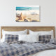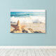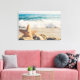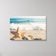 Leinwand mit einem landschaftlichen Foto. Ein großes Set aus Seestern direkt am Sandstrand. Ein schönes blaues Meer mit weißen Wellen im Hintergrund.