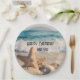 Papier Teller mit einem landschaftlichen Foto. Ein großes Set aus Seestern direkt am Sandstrand. Ein schönes blaues Meer mit weißen Wellen im Hintergrund.