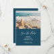 Save the Date Karte mit einem landschaftlichen Foto. Ein großes Set aus Seestern direkt am Sandstrand. Ein schönes blaues Meer mit weißen Wellen im Hintergrund.