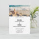 Hochzeitseinladung mit einem landschaftlichen Foto. Ein großes Set aus Seestern direkt am Sandstrand. Ein schönes blaues Meer mit weißen Wellen im Hintergrund.