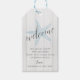 Rustic Beach Wedding "Begrüßung" Gefallen, Geschenk und Begrüßungstags mit einer gedämpften blauen Vintagen Seesternillustrierung und rustikal hellgrauem Holzhintergrund mit personalisierten Namen und Hochzeitstag.
