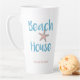 Blau und Korallen Typografie Beach House Kaffelatte Tasse, die Sie mit Ihrem Namen, Geschäft oder Datum der Einrichtung personalisieren können. Design aus Jenns Emporium.