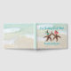 Zwei Sternenbrides Gästebuchdecks mit drei Zeilen Text nach Maß. Hintergrund und braune Seesterne mit Blumenkränzen in Blau und Grün, Rosa und Orange.
