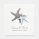 Probe Dinner Servietten mit zwei Seestern und benutzerdefinierten Textzeilen. Ein großes braunes und hellblaues Sternenpaar in der Mitte von weiß, oder ecru, Papier Servietten mit zwei Zeilen Vorlagentext darunter. Beinhaltet die Namen der Braut und des Bräutigams mit Anlass (Abendessen der Probe) und Datum. Verwendung auch für Duschen und Empfang.