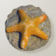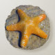 Dieses runde Kissen bietet einen bunten Seestern, der auf beiden Seiten auf einem Sandstrand ruht.
