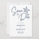 Nautical Save the Date card verfügt über ein marineblaues Schriftzeichen und eine sternförmige Abbildung auf weißem Hintergrund. Die Rückseite ist ein von der Hand gezeichnetes Wellenmuster. Ideal für Küsten-, Strand- und Meeresthemen.
