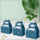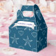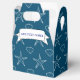 Weiße Seesterne und Muschelmuster auf ozeanblauem Hintergrund. Dekorative Gefälligkeitsboxen. Ändern des Namens, um ihn anzupassen. Geschenkidee für Groß und Klein, die Liebe des Meeres und des Meeres.