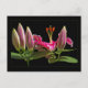 Ein atemberaubendes Foto einer offenen Sternenlilie mit Knospen und Blättern auf schwarzem Hintergrund. Stargazer, auch als orientalische Lilien bekannt, sind für ihr duftendes Parfum bekannt.