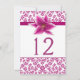 Elegante Hochzeitskarte Empfang Tischnummer in violettem Rosa und weißem, blumenfeuertem Muster. Die Grafiken eines violett rosa Satinbändchens und eine hübsche Sternenlililie zieren das obere Party des weißen Textbereichs. Personalisieren Sie die violette Zahl für jeden Tisch am Empfang.