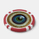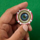 Nur die Iris und der Pupil eines Auges. Die Iris besteht aus drei konzentrischen Ringen, die jeweils tiefer als die letzte eindringen. Die äußerste Farbe ist weiß mit gelbbraunen Streifen. Die Mitte ist dunkelblau mit weißen bis hellblauen Streifen. Die grüne Mitte ist mit gelben Streifen überwunden. Der Schüler ist klein, rund und schwarz.