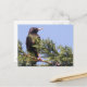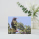 Auf dieser Postkarte befindet sich ein Foto eines Sternchens, das in einem Fichtenbaum sitzt. Der Vogel hat ein beattes Auge und seine Federn glimmen in der sonnigen Sonne am späten Nachmittag. Der schöne blaue Himmel bietet einen atemberaubenden Hintergrund.