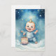 Eine wunderbare Illustration eines fröhlichen Babys in gemütlichen blauen Schlafanzügen, das in einer traumhaften, schneebedeckten Landschaft unter einem Sternenhimmel sitzt. Das Party trägt einen gestreiften Hut, der sich als glühende Kerze verdoppelt und Wärme und Magie ausstrahlt. Auf der einen Seite hält das Baby einen Funkler, auf der anderen einen festlichen Geburtstagskuchen, der mit bunten Bonbons, Zuckerguss-Tropfen und einer Single-Kerze geschmückt ist. Goldene Sterne funkeln um sich herum und schaffen eine knechte und feierliche Atmosphäre, die perfekt für den ersten Geburtstag eines Babys oder einen süßen, magischen Meilenstein ist.