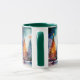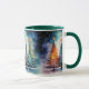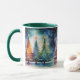 Genießen Sie den Zauber einer Winternacht mit dieser wunderschönen Keramik-Tasse, die eine atemberaubende, vom Antarktischen Himmel inspirierte Szene bietet. Der Hintergrund zeigt eine dunkle, sternförmige Nacht in Schwarz-Grün-Tönen mit funkelnden Sternen. Weiche weiße Wolken treiben über festliche Weihnachtsbäume, die in passenden Himmelsfarben dekoriert sind und jeweils mit einem goldenen Stern überzogen sind, was eine schneesichere und ruhige Atmosphäre schafft. Diese Tasse ist ideal für gemütliche Winterabende und Weihnachtsfeiern. Sie eignet sich ideal für Urlauber, die ein einzigartiges saisonales Design Liebe suchen.