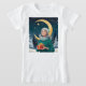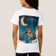 "Eine Cartoon-Frau, die auf einen sternvollen Winterhimmel blickt und ein Geschenkgeschenk hält. Ein Halbmond und Sternschnuppen mit einem schneebedeckten Wald im Hintergrund.Slogan: "Dieses Weihnachtsfest leuchten!" Farben: Weiche Blues, silberweiße Weiße, tiefe Grüntöne und Touchs goldgelber Gelbtöne."