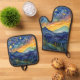 Diese aus hochwertigen, hitzebeständigen Materialien gefertigten Teile garantieren sowohl Sicherheit als auch Stil. Das faszinierende Design mit tiefer Blues und lebhaften Gelbtönen prägt die faszinierende Schönheit von Van Goghs Meisterwerk und lässt jedes Küchen-Unterfangen wie eine kreative Reise erscheinen. Ob Sie ein erfahrener Koch oder ein Zuhause-Cooking-Liebhaber sind, dieses elegante Set fügt Ihren kulinarischen Abenteuern eine Touch künstlerischen Flairs hinzu und ist somit das ideale Geschenk für Kunstliebhaber und Genießer. Mit diesem wunderschönen Ofen-Mitt und dem Set des Topfbesitzers verwandeln Sie das Kochen in eine Sternennacht der Inspiration und Kreativität.
